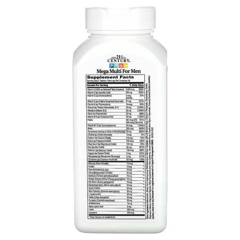 21st Century Mega Multi for Men is a high-potency multivitamin supplement specifically formulated to meet the nutritional needs of men. It contains a comprehensive blend of essential vitamins, minerals, and nutrients that support overall health, energy levels, and wellness. Designed to fill gaps in your diet, this multivitamin can help promote heart health, immune function, energy metabolism, and much more. It’s a convenient way to ensure you're getting the nutrients you need to stay healthy and active.