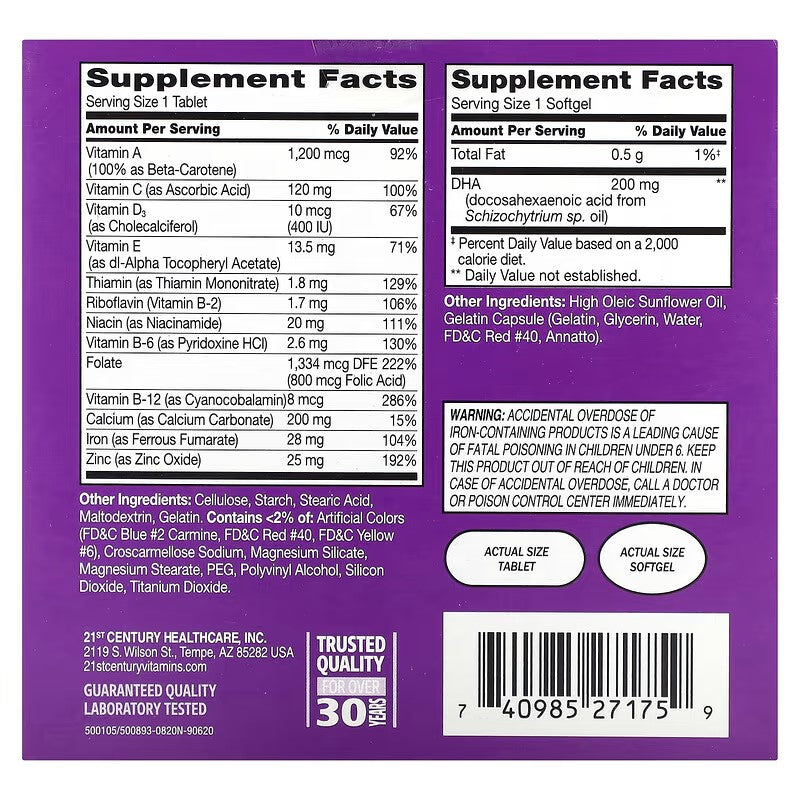 21st Century Prenatal Multivitamin Plus DHA is an excellent choice for pregnant women seeking a comprehensive, convenient, and high-quality supplement to support their health and the development of their baby. With the added benefit of DHA for brain and eye development, this prenatal vitamin ensures that both mother and child get the nutrients they need throughout pregnancy. Always consult your healthcare provider before starting any new supplement, especially during pregnancy.