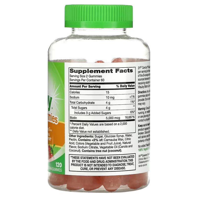 21st Century VitaJoy Biotin Gummies are a delicious and convenient way to support healthy hair, skin, and nails. Biotin, also known as Vitamin B7, is a water-soluble vitamin that is essential for the metabolism of carbohydrates, fats, and proteins. These gummies provide a high dose of 5,000 mcg of biotin per serving, offering a simple and enjoyable way to help maintain optimal hair growth, skin health, and nail strength.