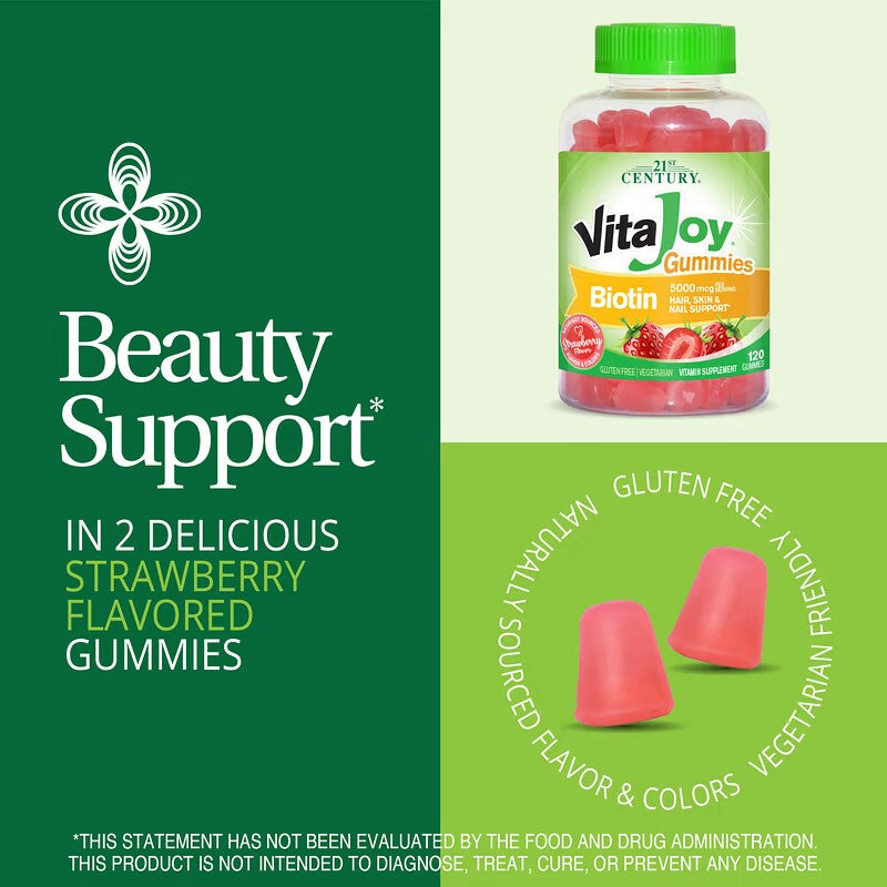 21st Century VitaJoy Biotin Gummies, Strawberry Flavor, 5,000 mcg are a fun, delicious, and effective way to support the health of your hair, skin, and nails. With their high-potency formula and great taste, these gummies provide a simple and enjoyable method of incorporating biotin into your daily routine. Always consult your healthcare provider before starting any new supplement regimen, particularly if you have any health concerns or are on medication.