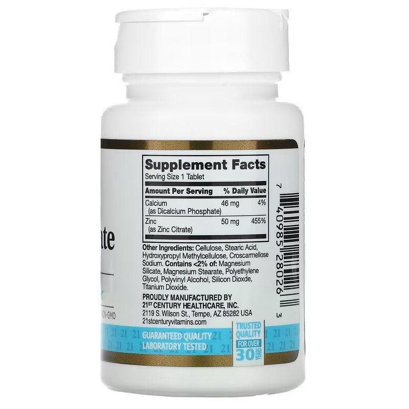 21st Century Zinc Citrate is a dietary supplement providing 50 mg of Zinc Citrate per tablet. Zinc is an essential mineral that plays a crucial role in many bodily functions.