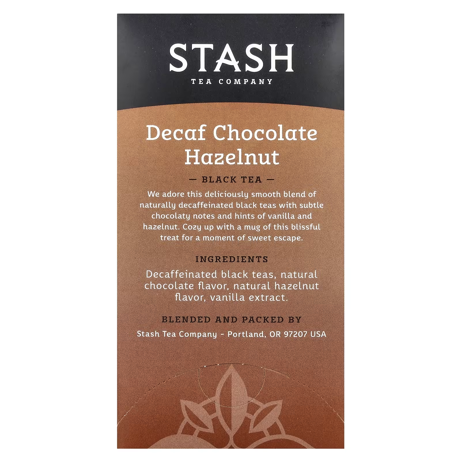 Decaffeinated Black Tea, Natural Chocolate Flavor, Natural Hazelnut Flavor, Vanilla Extract.