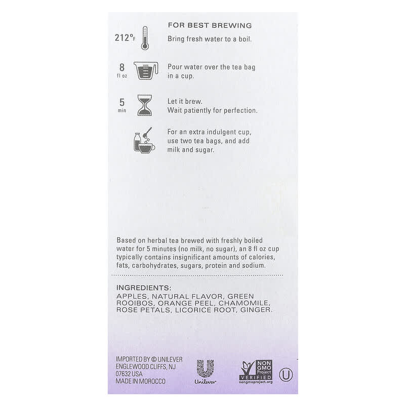 Apples, Natural flavor, Green Rooibos, Orange Peel, Chamomile, Rose Petals, Licorice root, Ginger.