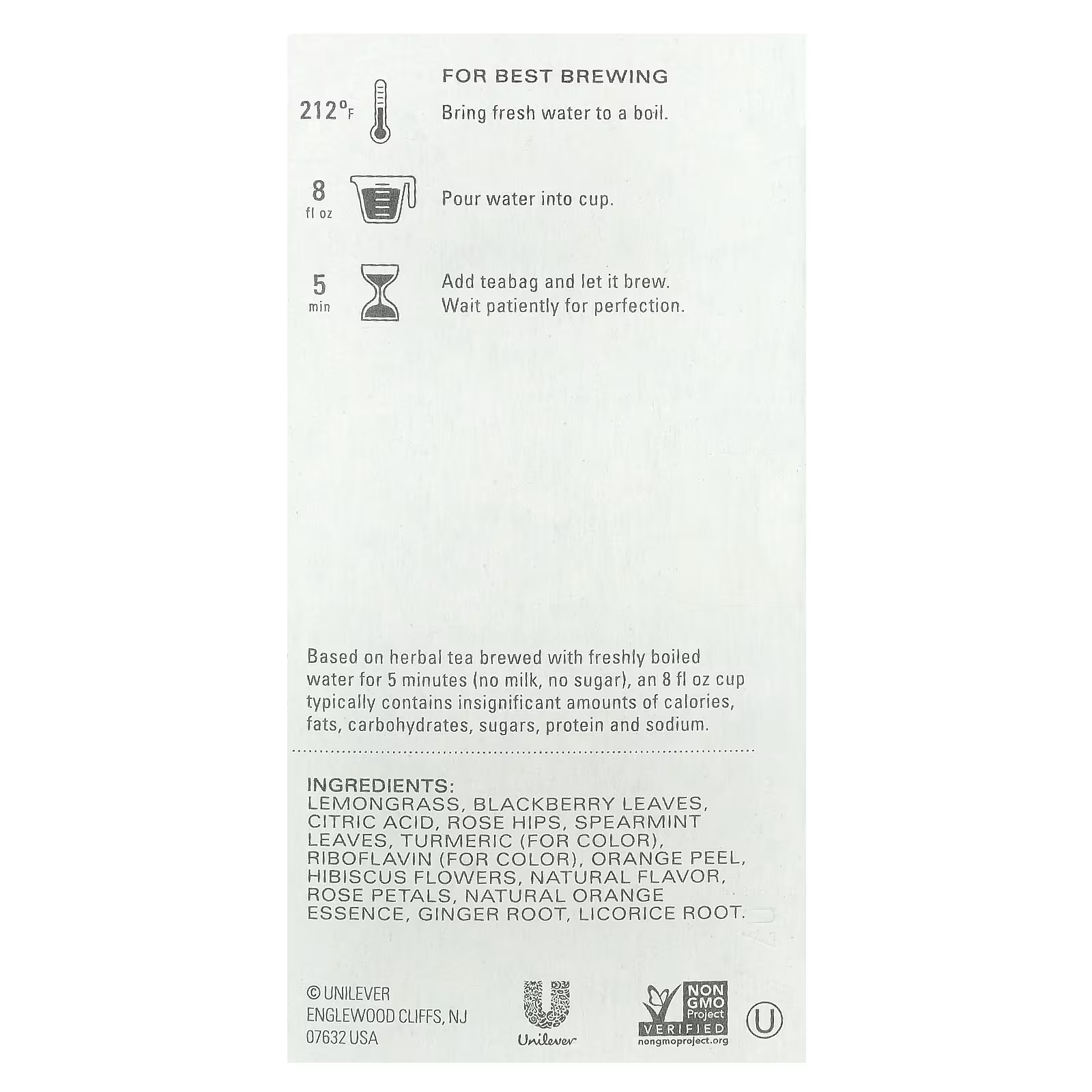 Lemongrass, Blackberry leaves, Citric Acid, Rose Hips, Spearmint Leaves, Turmeric (for color), Riboflavin (for color), Orange Peel, Hibiscus Flowers, Natural flavor, Rose Petals, Natural Orange Essence, Ginger Root, Licorice Root.
