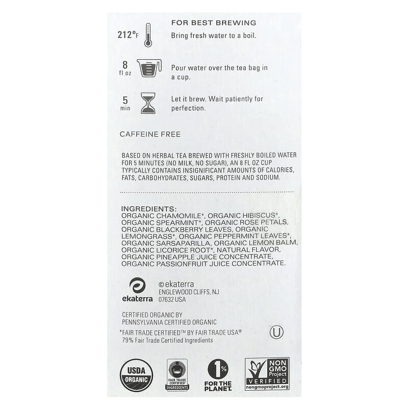 Organic Chamomile*, Organic Hibiscus*, Organic Spearmint*, Organic Rose Petals, Organic Blackberry Leaves, Organic Lemongrass*, Organic Peppermint Leaves*, Organic Sarsaparilla, Organic Lemon Balm, Organic Licorice Root*, Natural Flavor, Organic Pineapple Juice Concentrate, Organic Passionfruit Juice Concentrate.