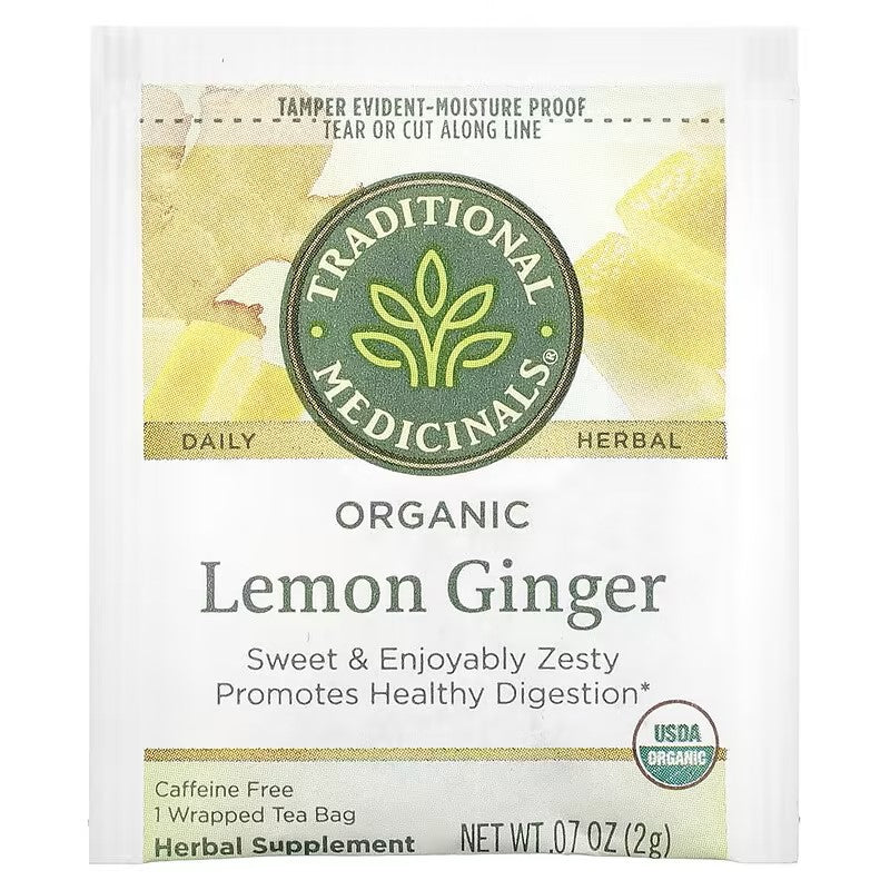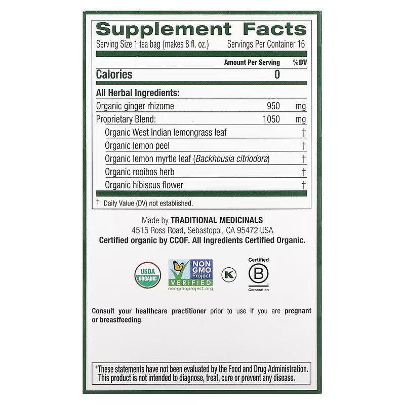 Traditional Medicinals' Organic Lemon Ginger Herbal Tea is crafted from a blend of certified organic ingredients, each selected for its unique flavor and traditional health benefits. The detailed ingredients are: