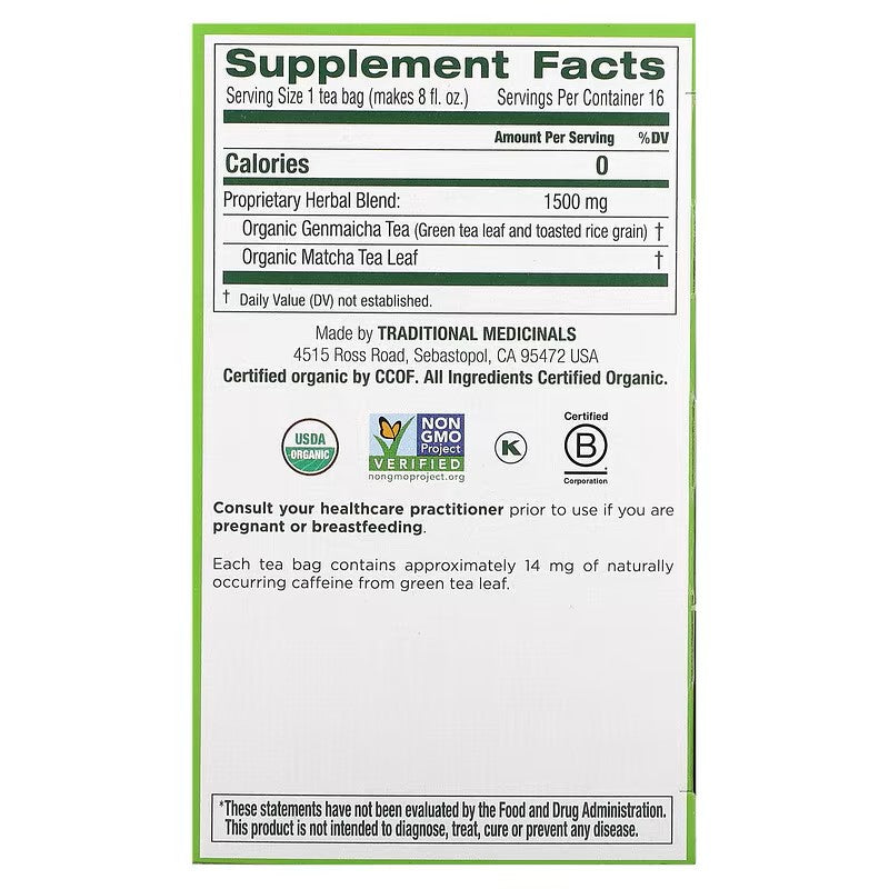 Traditional Medicinals, Organic Green Tea with Toasted Rice, Matcha, 16 Wrapped Tea Bags, 0.85 oz (24 g)