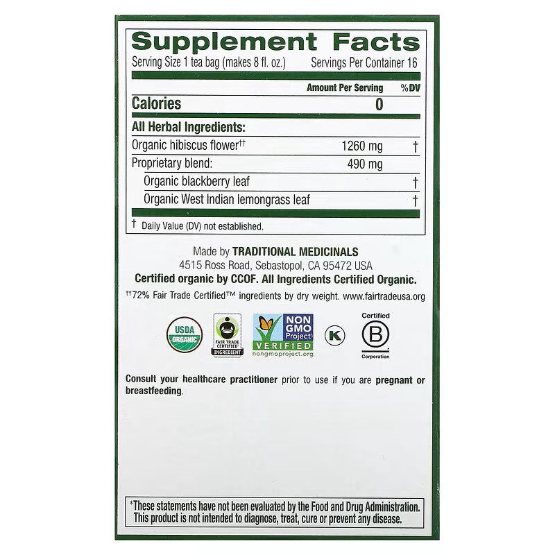 Traditional Medicinals, Organic Hibiscus, Caffeine Free, 16 Wrapped Tea Bags, 0.99 oz (28 g)