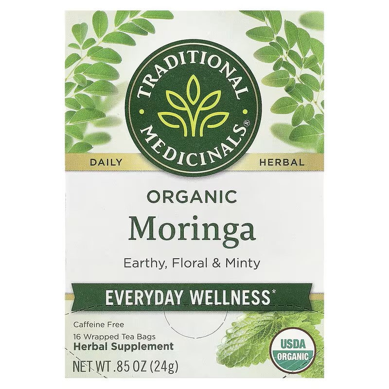 Traditional Medicinals offers Organic Moringa with Spearmint & Sage Tea, a caffeine-free herbal infusion designed to support everyday wellness.