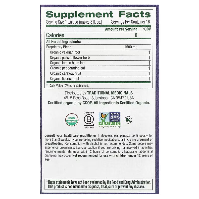 Traditional Medicinals' Organic Nighty Night Extra is a caffeine-free herbal tea formulated to promote relaxation and support a good night's sleep. This blend combines several organic herbs known for their calming properties.