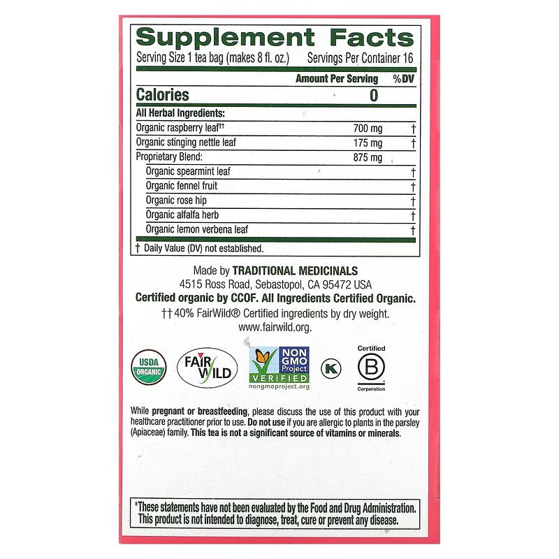 Traditional Medicinals, Organic Pregnancy Tea, Raspberry Leaf, Caffeine Free, 16 Wrapped Tea Bags, 0.99 oz (28 g)