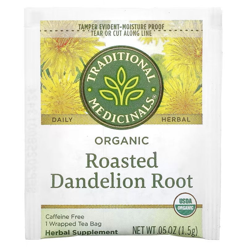 Traditional Medicinals' Organic Roasted Dandelion Root Tea is a caffeine-free herbal infusion crafted from sustainably harvested dandelion roots. Renowned for its pleasantly roasted flavor with bitter notes, this tea is designed to stimulate the liver and support healthy digestion.