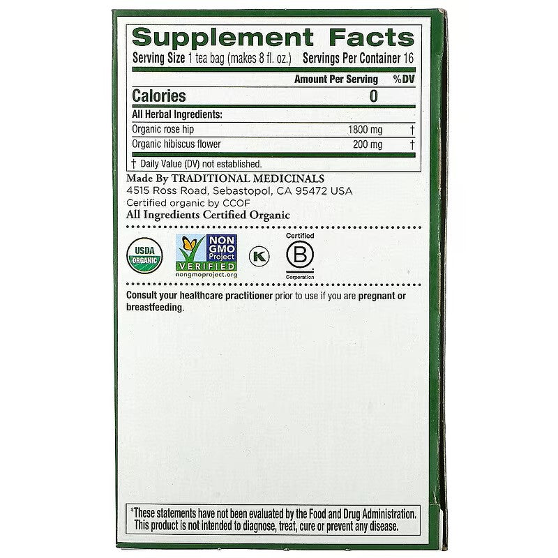 Traditional Medicinals, Organic Rose Hips with Hibiscus, Caffeine Free, 16 Wrapped Tea Bags, 1.13 oz (32 g)
