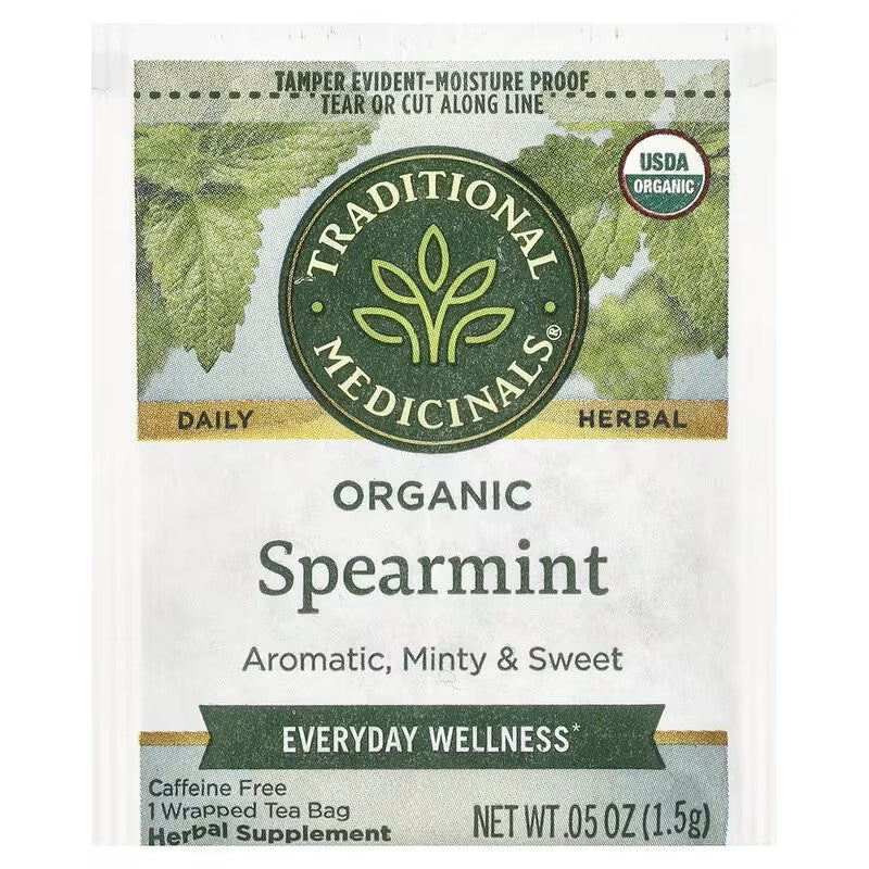 Traditional Medicinals' Organic Spearmint Tea is a caffeine-free herbal infusion celebrated for its refreshing taste and invigorating aroma.