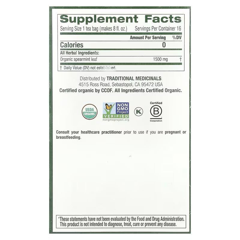 Traditional Medicinals, Organic Spearmint, Caffeine Free, 16 Wrapped Tea Bags, 0.85 oz (24 g)