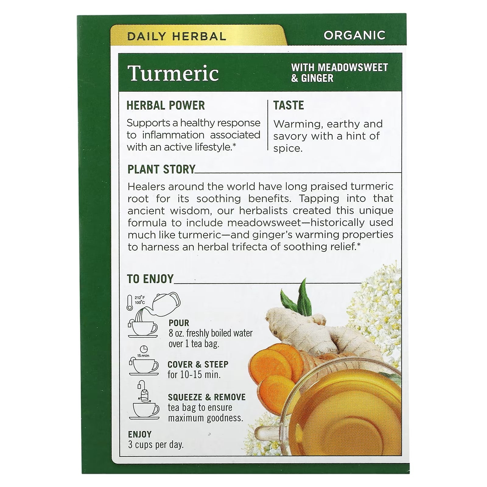 Traditional Medicinals' Organic Turmeric with Meadowsweet & Ginger is a caffeine-free herbal tea crafted to support joint health and digestion.