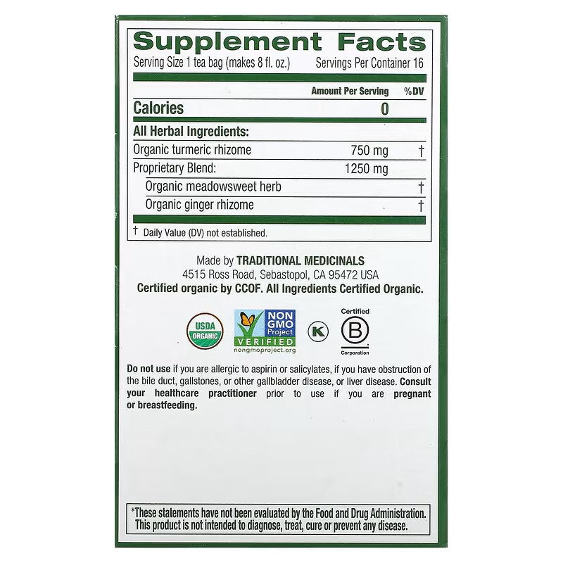 Traditional Medicinals, Organic Turmeric with Meadowsweet & Ginger, Caffeine Free, 16 Wrapped Tea Bags, 1.13 oz (32 g)